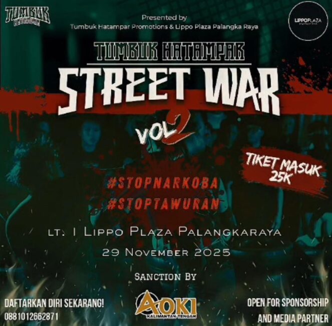 PALANGKA RAYA, Kalteng.co – Promotor Tumbuk Hatampar (TH) Promotion Nauval Ababil Sukarna Durasid memastikan bahwa event Street War Volume 2 akan segera dilaksanakan pada 29 November 2025, setelah sebelumnya sempat tertunda.