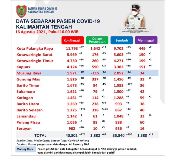 Juru bicara Satgas Covid-19 Barsel, drg. Daryomo Sukiastono SH kepada sejumlah wartawan, Selasa (17/8/2021), mengatakan, berdasarkan hasil swab dari warga yang pernah kontak pada 16 Agustus, bertambah 148 orang terkonfirmasi positif. Dan angka itu, kata Daryomo, bisa dikatakan kasus tertinggi se-Kalteng.