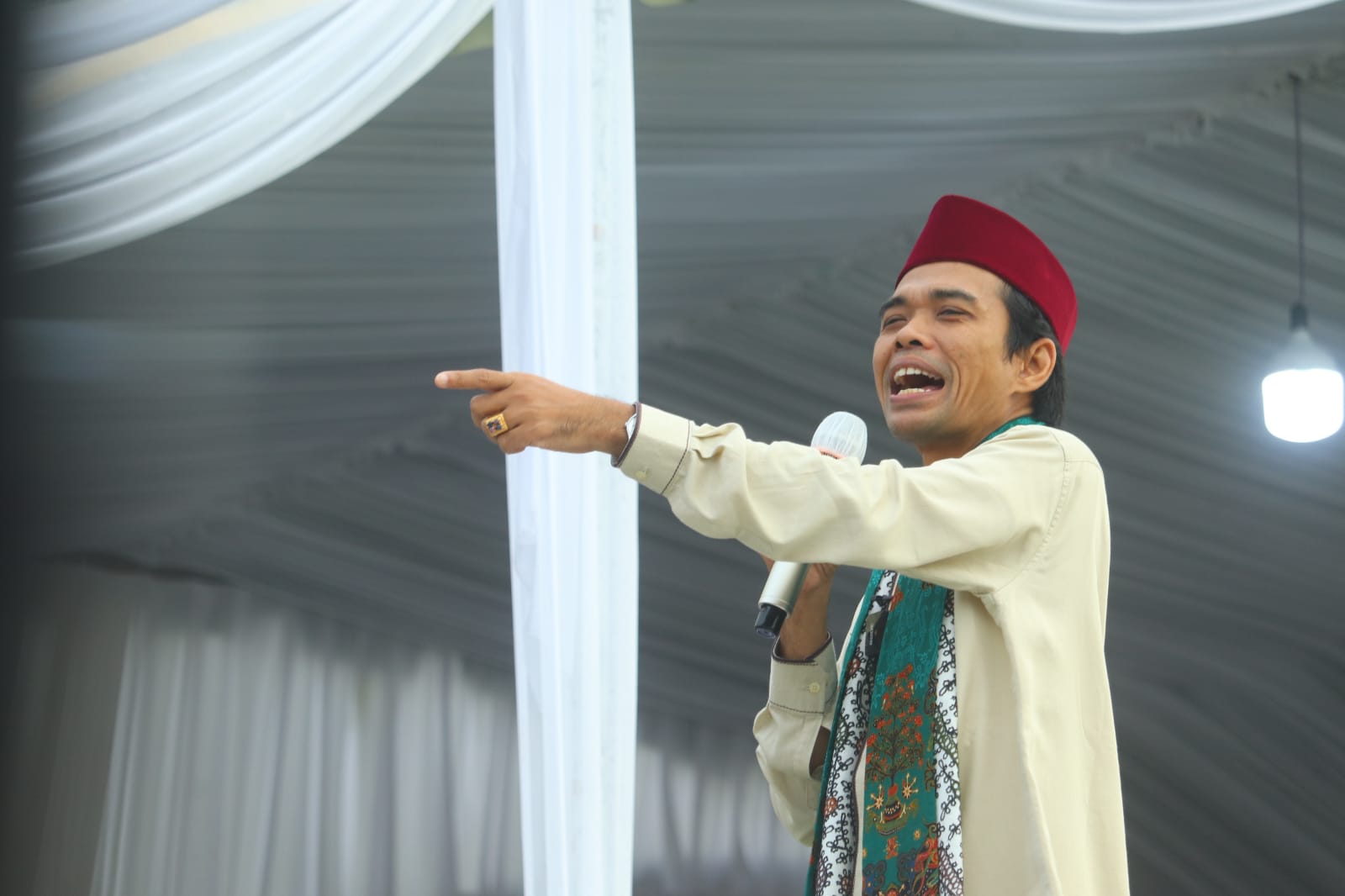 CERAMAH: Ustadz H. Abdul Somad saat menyampaikan tausiyah kepada ribuan jemaah yang hadir pada Murung Raya Bersyukur di Halaman Masjid Agung Al Istiqlal Kota Puruk Cahu, Selasa pagi (18/4/2022).