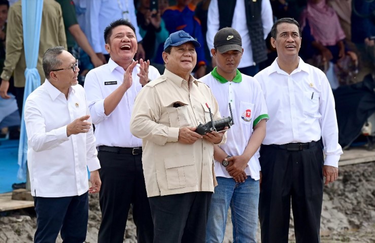 Di lokasi kegiatan, Prabowo Subianto meninjau langsung transformasi lahan rawa seluas 105 hektare yang sebelumnya tidak produktif, kini telah diubah menjadi area sawah modern.
