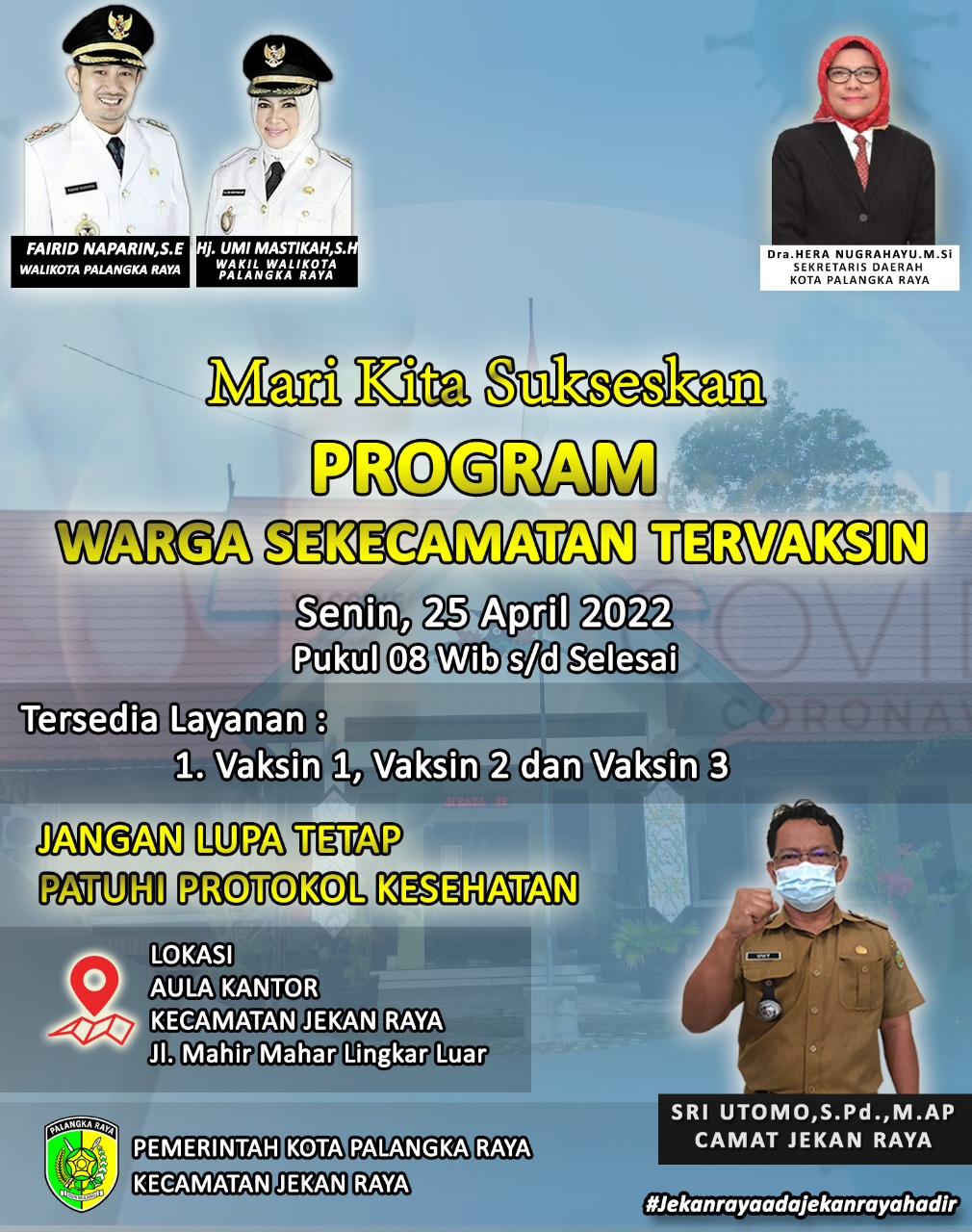 Dikatakannya kegiatan vaksinasi dilakukan selain untuk menyukseskan program vaksinasi Kota Palangka Raya, juga sebagai upaya pihaknya membantu masyarakat Kecamatan Jekan Raya yang ingin mudik.