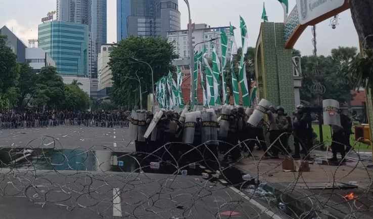 Namun, massa aksi tidak bergeming dan terus mencoba menjebol kawat berduri untuk mendekati Gedung Grahadi. Aksi lempar barang terus berlanjut hingga saat ini.