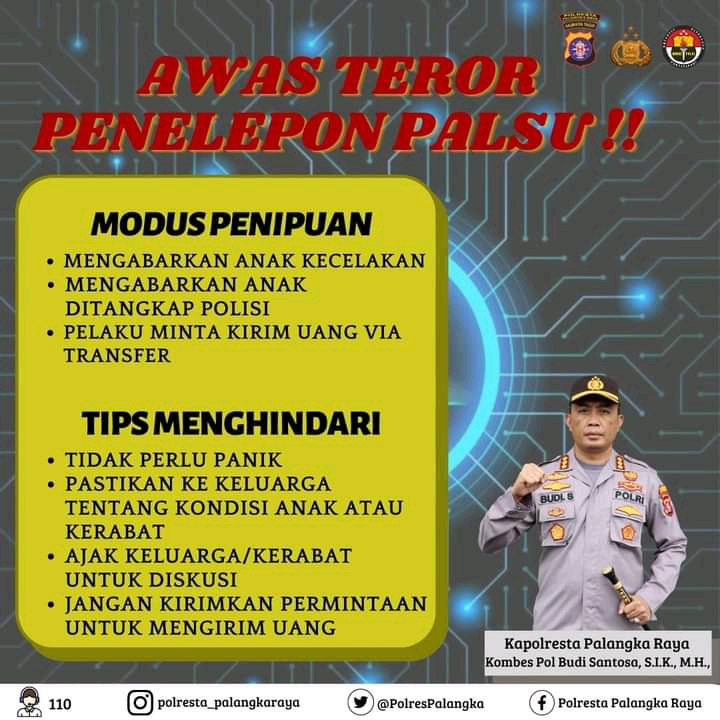 PALANGKA RAYA, Kalteng.co – Polisi Imbau Waspada Modus Penipuan Via Telepon. Kepolisian dari Polresta Palangka Raya mengajak masyarakat agar lebih hati-hati ketika menerima sambungan telepon dari orang tak dikenal.