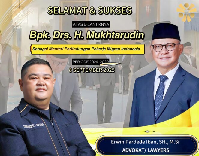 “Saya secara pribadi maupun sebagai advokat menyampaikan selamat kepada Bapak Drs. H. Mukhtarudin atas amanah besar ini. Beliau punya kapasitas dan integritas untuk memperkuat regulasi sekaligus memastikan perlindungan hukum bagi pekerja migran Indonesia,” ucap Erwin, Selasa (9/9/2025).