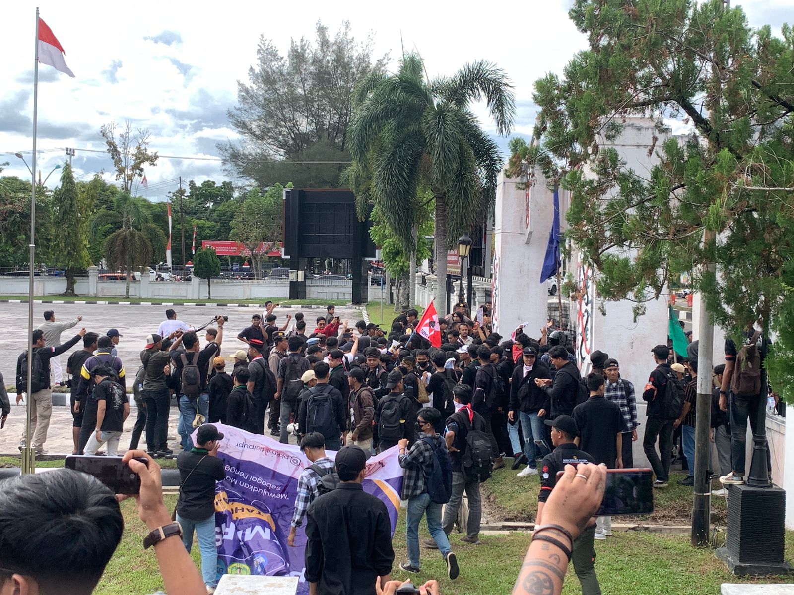 Mahasiswa tampak bersemangat menyuarakan aspirasi mereka, meski menghadapi barisan aparat keamanan yang menjaga ketat pintu masuk gedung.