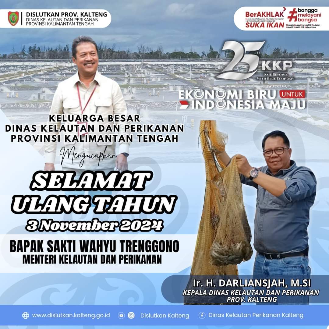 PALANGKA RAYA, Kalteng.co – Kepala Dinas Kelautan dan Perikanan (Kadislutkan) Kalimantan Tengah, Ir. H. Darliansjah, M.Si., menyampaikan ucapan selamat ulang tahun kepada Menteri Kelautan dan Perikanan Republik Indonesia, Sakti Wahyu Trenggono, yang merayakan hari lahirnya pada Minggu (03/11/2024).