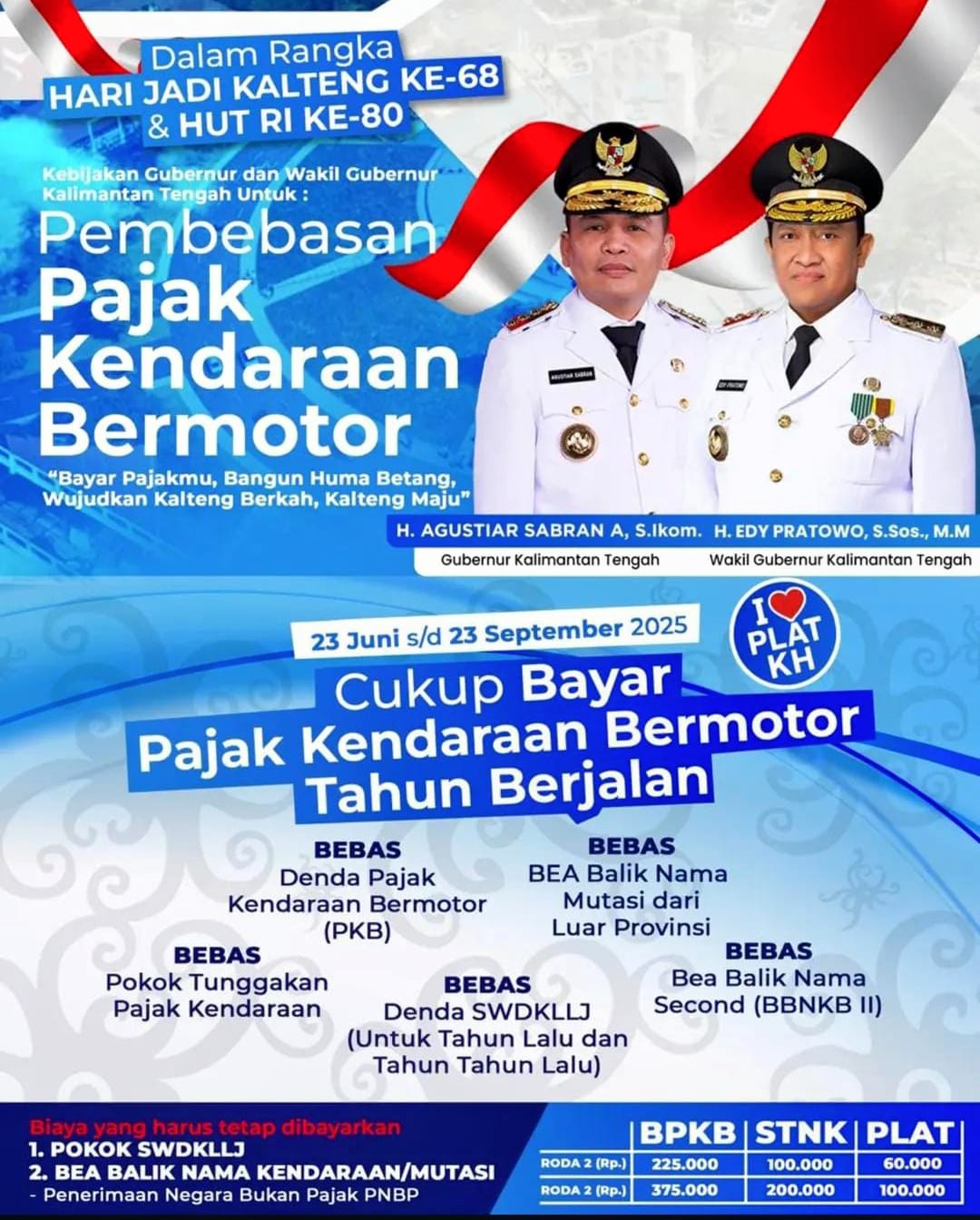 PALANGKA RAYA, Kalteng.co –Pemerintah Provinsi Kalimantan Tengah kembali memberikan stimulus bagi masyarakat dalam rangka Hari Jadi ke-68 Provinsi Kalimantan Tengah dan HUT ke-80 Republik Indonesia. Melalui kebijakan Gubernur dan Wakil Gubernur, masyarakat diberikan pembebasan pajak kendaraan bermotor (PKB) dalam periode khusus mulai 23 Juni hingga 23 September 2025.