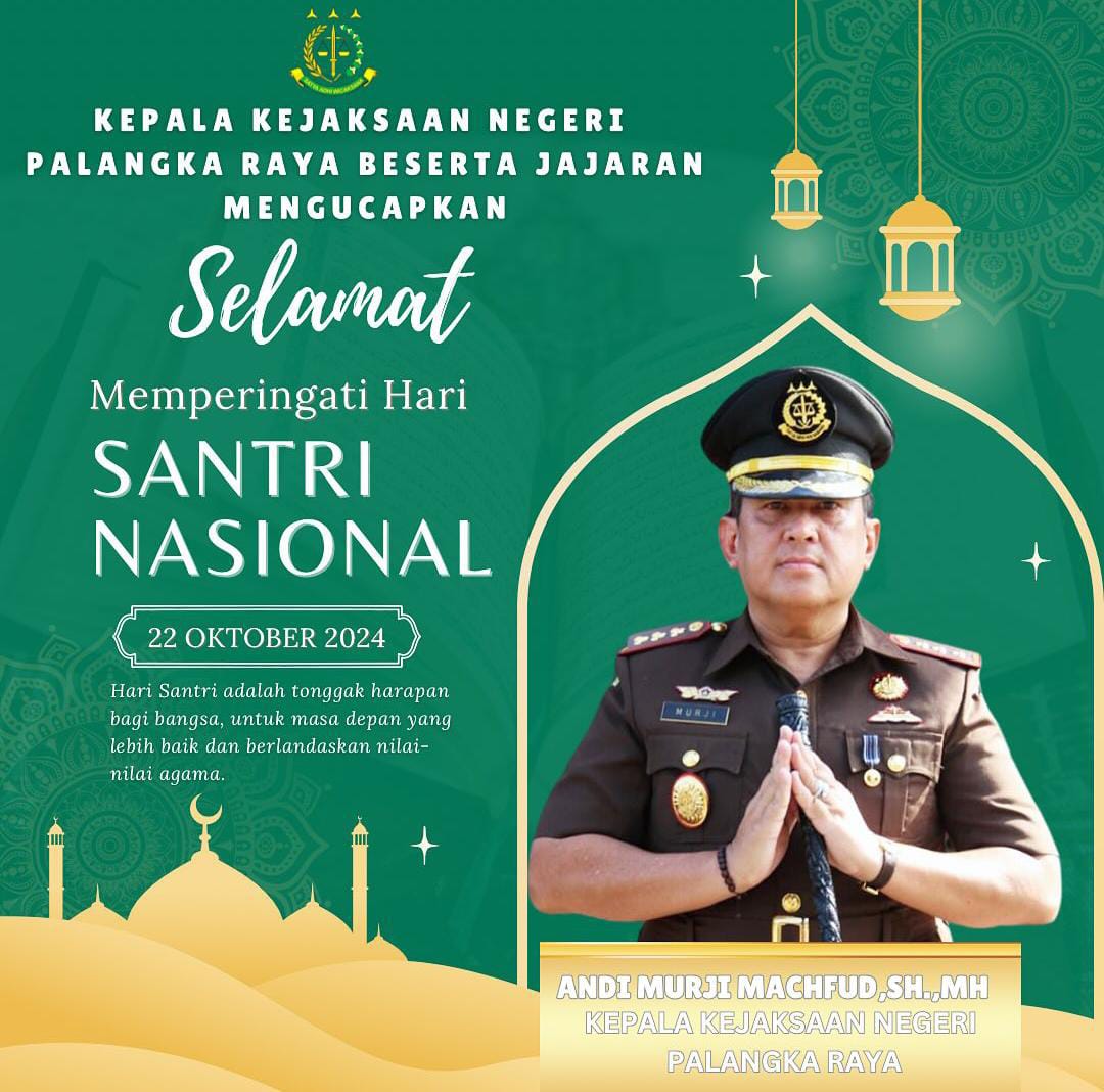 PALANGKA RAYA, Kalteng.co – Kepala Kejaksaan Negeri (Kajari) Palangka Raya, Andi Murji Machfud, SH., MH., memaknai Hari Santri Nasional (HSN) yang jatuh pada hari ini, Selasa (22/10/2024), sebagai momentum penting untuk memperkuat peran santri dalam penegakan hukum, keadilan, dan penguatan moral bangsa.