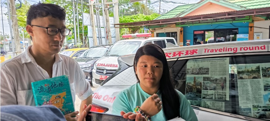 BANJAR BARU, Kalteng.co-Chee Shin Yi (Miss Gloria) dan Fan Yuhu, penjelajah dunia berkewarganegaraan China dan Malaysia yang telah berkeliling dunia sejak enam bulan lalu menggunakan mobil listrik.