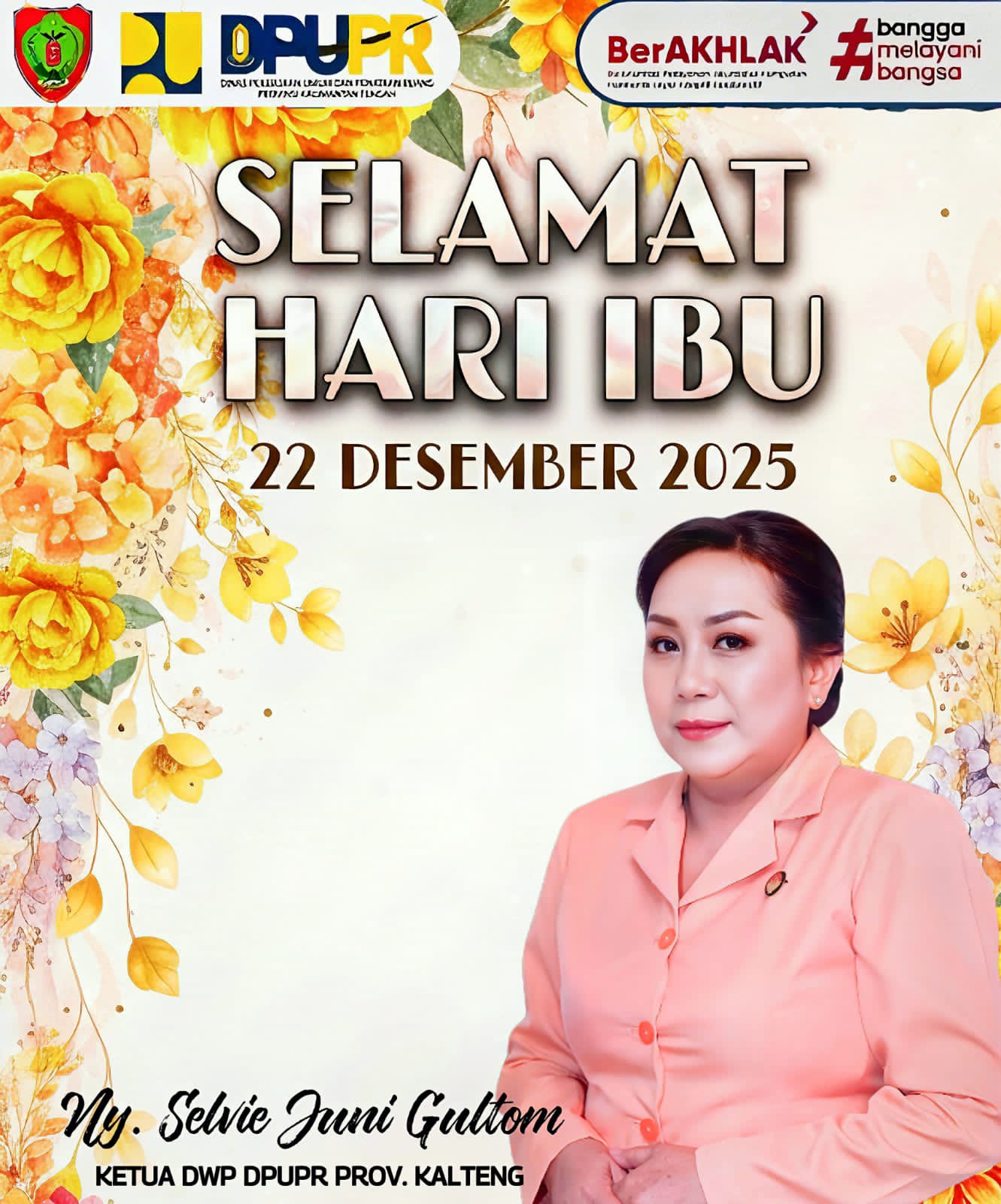 PALANGKA RAYA, Kalteng.co – Ketua Dharma Wanita Persatuan (DWP) Dinas Pekerjaan Umum dan Penataan Ruang (PUPR) Provinsi Kalimantan Tengah, Ny. Selvie Juni Gultom, SE., menyampaikan ucapan selamat memperingati Hari Ibu yang jatuh pada 22 Desember 2025.
