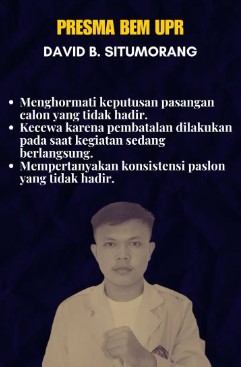 “Yang juga kita sayangkan bahwa 2 Paslon yang tidak berhadir saat dialog adu gagasan dengan mahasiswa tersebut, justru seharusnya lebih berani bertemu mahasiswa, karena sama-sama masih terbilang berusia muda, tapi yang terjadi sebaliknya malah Paslon yang senior dari segi usia, justru lebih berani menyampaikan gagasannya secara langsung dihadapan mahasiswa,”celetuk salah seorang mahasiswa UPR lainnya.