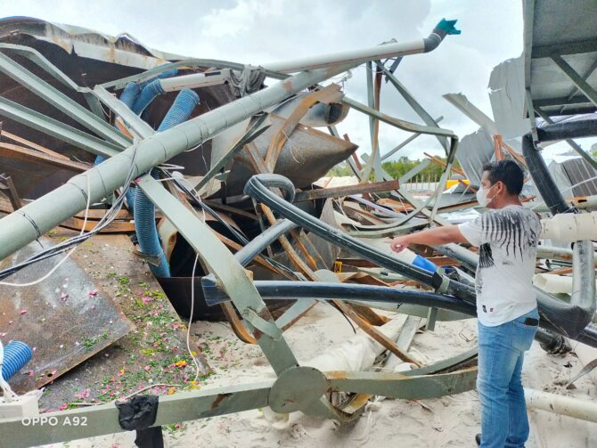 Di mana hasil olah TKP, kontruksi bangunan penampung pasir yang terbuat dari plat besi dengan tebal 1,2 cm, panjang dan lebar 60 cm x60. jarak antara tiang satu dengan yang lainnya 3 M x 5,6 M. Lalu lebar corong atas yang roboh 5 m dan kedalaman corong 5, 25 m yang didalam corong masih terdapat sisa pasir.