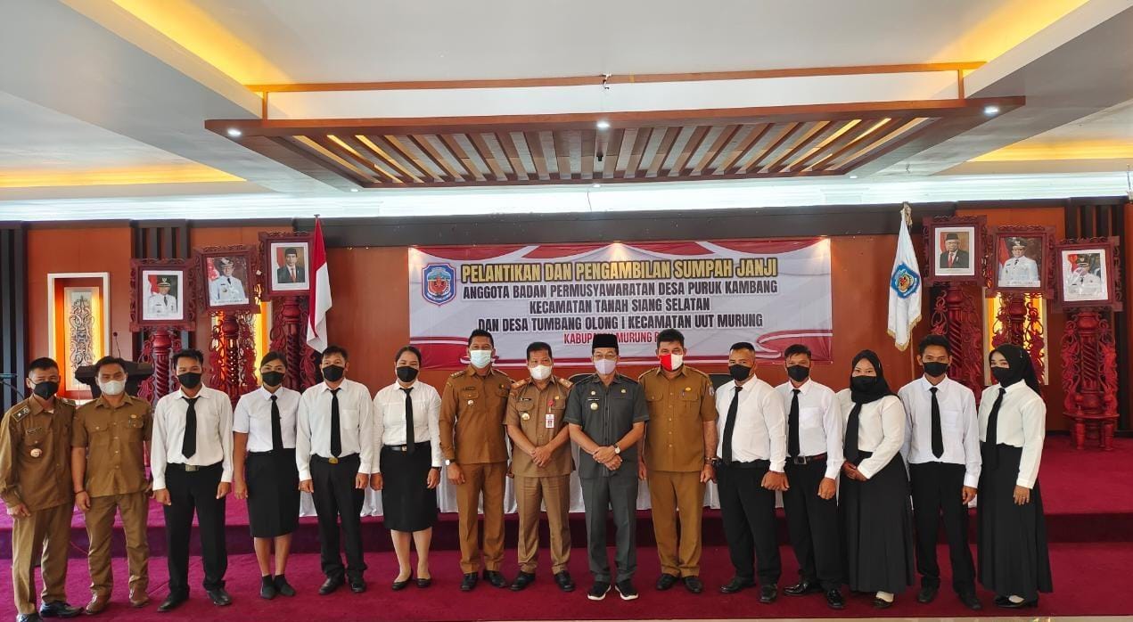 PURUK CAHU, Kalteng.co-Pelantikan dan pengambilan sumpah janji anggota Badan Permusyarawatan Desa (BPD) di dua desa, Desa Puruk Kambang dan Desa Tumbang Olong I dipimpin langsung oleh Bupati Murung Raya (Mura), Perdie M.Yoseph di Gedung B Setda Mura, Senin (26/9/2022).