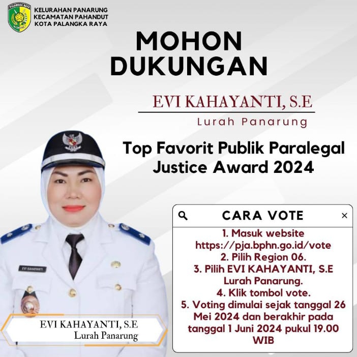 JAKARTA, Kalteng.co – Mari dukung Lurah Panarung, Evi Kahayanti, SE, yang saat ini tengah berkompetisi dalam lomba Paralegal Justice Award 2024 membawa nama harum Provinsi Kalimantan Tengah, khususnya Kota Palangka Raya. Ikuti langkah-langkah berikut untuk memberikan suara Anda: