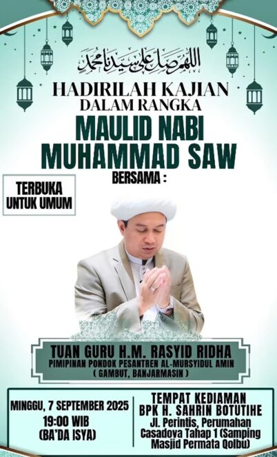 PALANGKA RAYA, Kalteng.co – Dalam rangka memperingati Maulid Nabi Muhammad SAW, PT. Kelvin Berkah Mandiri atau Perumahan Casadova akan menggelar kajian agama pada Minggu, 7 September 2025. Acara akan dilaksanakan di kediaman H. Sahrin Botutihe, Jalan Perintis, Perumahan Casadova Tahap 1 (samping Masjid Permata Qolbu), mulai pukul 19.00 WIB ba’da Isya.