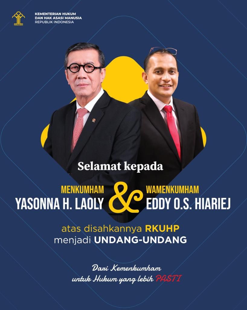 Menteri Hukum dan HAM, Yasonna H. Laoly mengatakan, pengesahan ini merupakan momen bersejarah di Indonesia dalam penyelenggaraan hukum pidana, setelah bertahun-tahun menggunakan KUHP produk kolonial Belanda, Indonesia saat ini akhirnya telah memiliki KUHP sendiri.