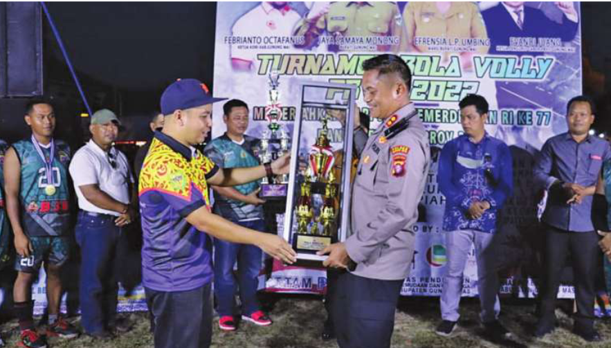 KUALA KURUN,kalteng.co – Turnamen Voli PBVSI Cup 2022 dalam rangka memeriahkan HUT ke-77 RI sudah selesai digelar dengan sukses beberapa waktu lalu, dan sebagai juara pertama adalah tim Bhayangkara binaan Polres Gumas. Anggota Dewan Perwakilan Rakyat Daerah (DPRD) Kabupaten Gunung Mas (Gumas) Evandi Juang pun memberikan support dan apresiasi terhadap kesuksesan turnamen voli yang dilaksanakan Pengurus Kabupaten Persatuan Bola Voli Seluruh Indonesia (PBVSI) Gunung Mas itu. “Kami sangat mengapresiasi terhadap turnamen bola voli tersebut. Dengan adanya kegiatan seperti itu dapat memberikan hiburan kepada masyarakat yang menonton,” kata anggota DPRD Gumas Evandi Juang yang juga sebagai ketua Pengkab PBVSI Gumas, belum lama ini.