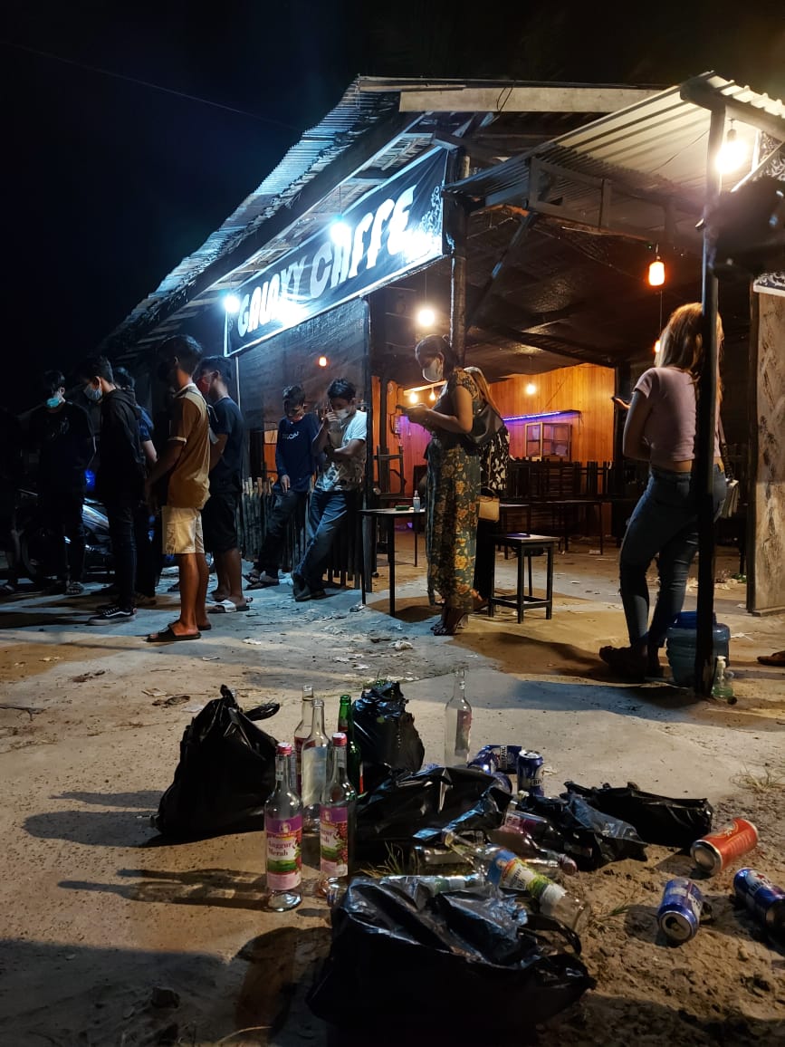 “Saat diperiksa, anggota Raimas menemukan puluhan botol bekas minuman keras jenis Anggur Merah dan puluhan kaleng Bir Bintang di Cafe tersebut dan para pengunjung banyak yang tidak mematuhi protokol kesehatan seperti tidak menjaga jarak dan tidak menggunakan masker,” ujarnya.