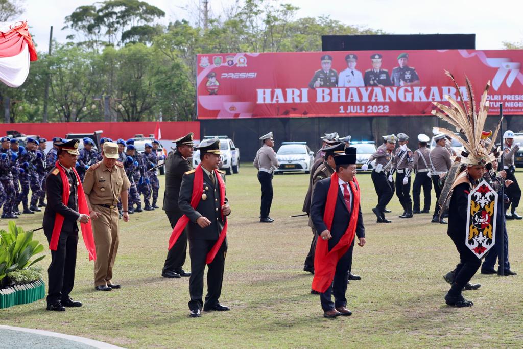 Upacara memperingati Hari Bhayangkara ke-77 itu sendiri dipimpin secara langsung oleh Kapolda Kalteng, Irjen Pol Nanang Avianto yang dihadiri oleh Forum Koordinasi Perangkat Daerah (Forkompinda) di lingkup Bumi Tambun Bungai ini.