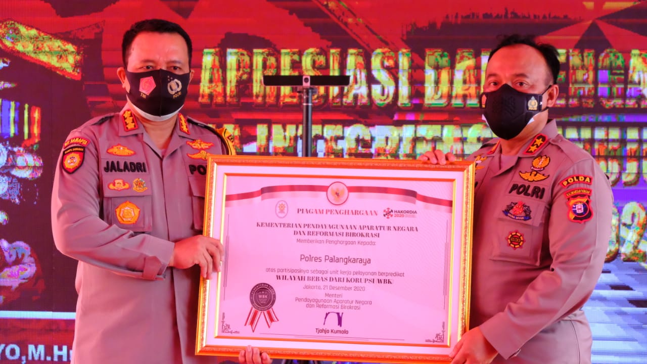 dua satuan kerja (Satker) Polda Kalteng yaitu Ditreskrimsus Polda Kalteng dan Polresta Palangka Raya mendapatkannya. Kapolda Kalteng Irjen Pol Dr. Dedi Prasetyo, M.Hum., M.Si., M.M menyerahkan piagam penghargaan kepada Dirreskrimsus Kombes Pol Pasma Royce dan Kapolresta Palangka Raya Kombes Pol Dwi Tunggal Jaladri bertempat di Lapangan Mapolda Kalteng, Selasa (22/12).