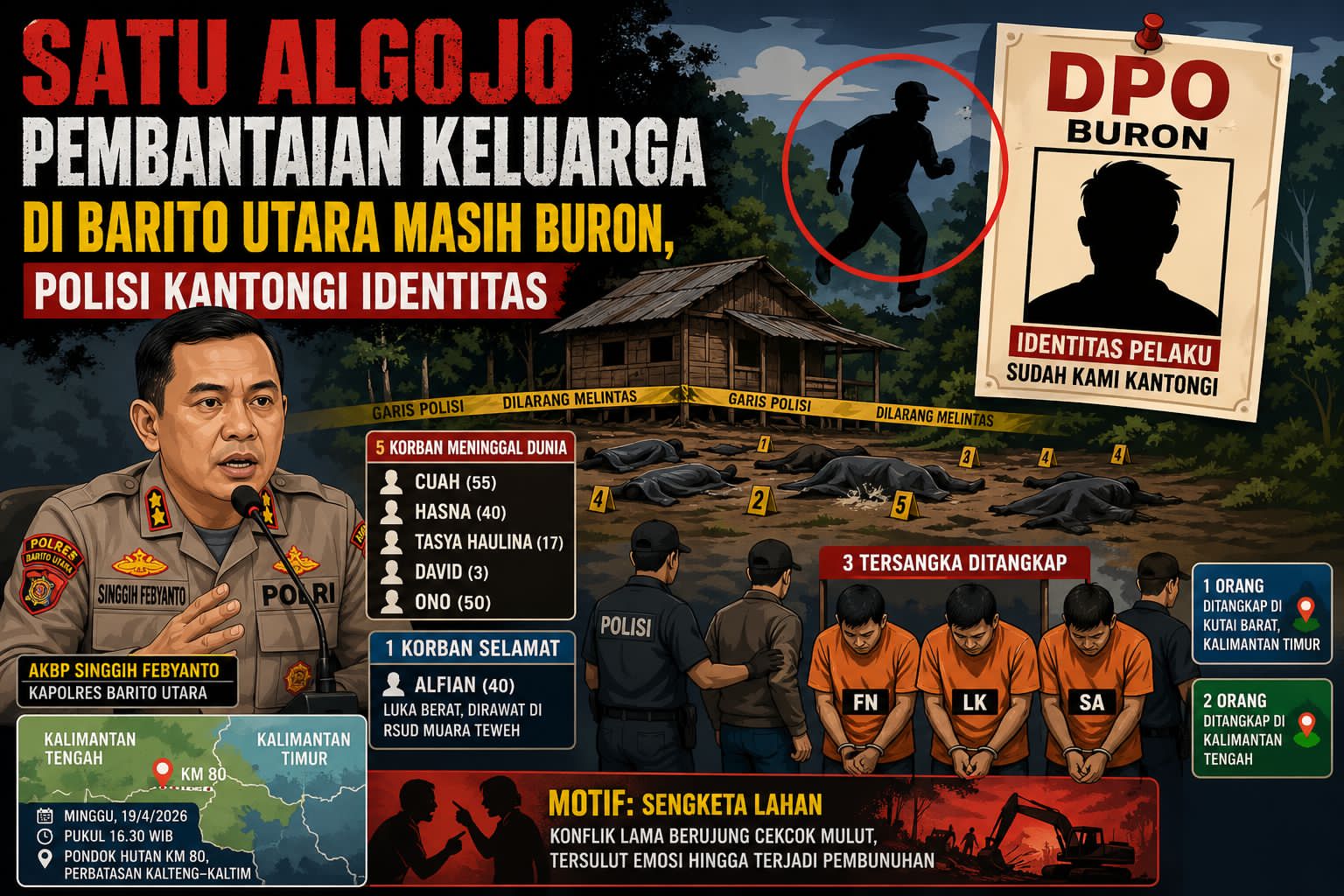 MUARA TEWEH, Kalteng.co – Kasus pembunuhan sadis yang menewaskan satu keluarga di wilayah perbatasan Kalimantan Tengah dan Kalimantan Timur mulai menemukan titik terang. Polres Barito Utara mengungkap bahwa total tersangka dalam kasus ini berjumlah empat orang, namun satu di antaranya masih buron dan masuk Daftar Pencarian Orang (DPO).