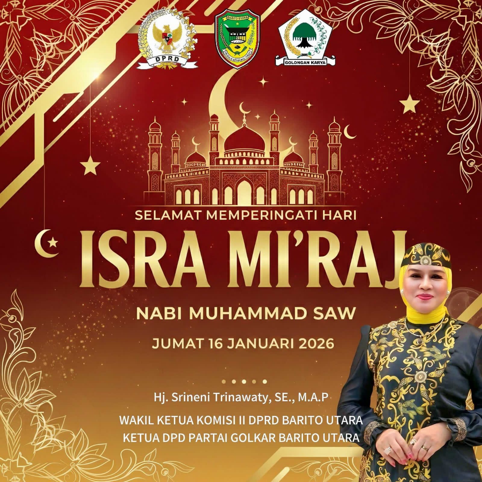 MUARA TEWEH, Kalteng.co – Wakil Ketua Komisi II DPRD Kabupaten Barito Utara, Hj. Srineni Trianawaty, SE., M.A.P., menyampaikan ucapan selamat kepada umat Islam yang memperingati Hari Isra Mi’raj Nabi Muhammad SAW 27 Rajab 1447 Hijriah/2026 Masehi, Jumat (16/1/2026).