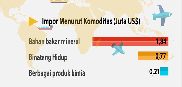 “Nilai impor dari Singapura berupa bahan bakar mineral (aspal) mencapai US$1,84 juta. Untuk Australia berupa binatang hidup, mesin/pesawat mekanik, logam dasar lainnya, produk industri farmasi, dan golongan barang lainnya yang mencapai US$0,90 juta,” ucapnya, belum lama ini.