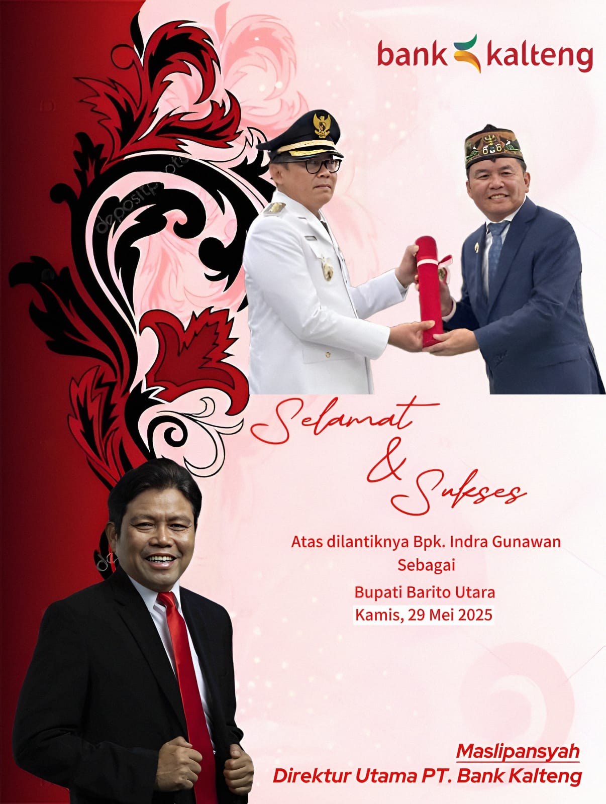 PALANGKA RAYA, Kalteng.co – Direktur Utama PT. Bank Kalteng, Maslipansyah, menyampaikan ucapan selamat dan dukungan penuh atas pelantikan Indra Gunawan sebagai Penjabat (Pj) Bupati Barito Utara menggantikan Muchlis, yang resmi dilantik oleh Gubernur Kalimantan Tengah, H. Agustiar Sabran, di Rumah Jabatan Gubernur Kalteng, Palangka Raya. Kamis, 29 Mei 2025.