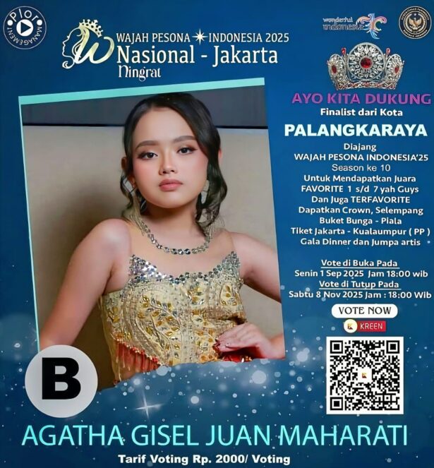 PALANGKA RAYA, Kalteng.co – Kebanggaan tersendiri hadir bagi masyarakat Kota Palangka Raya. Salah satu putri terbaik daerah, Agatha Gisel Juan Maharati, berhasil masuk sebagai finalis dalam ajang bergengsi Wajah Pesona Indonesia (WPI) 2025 Season 10 yang akan diselenggarakan di Jakarta.
