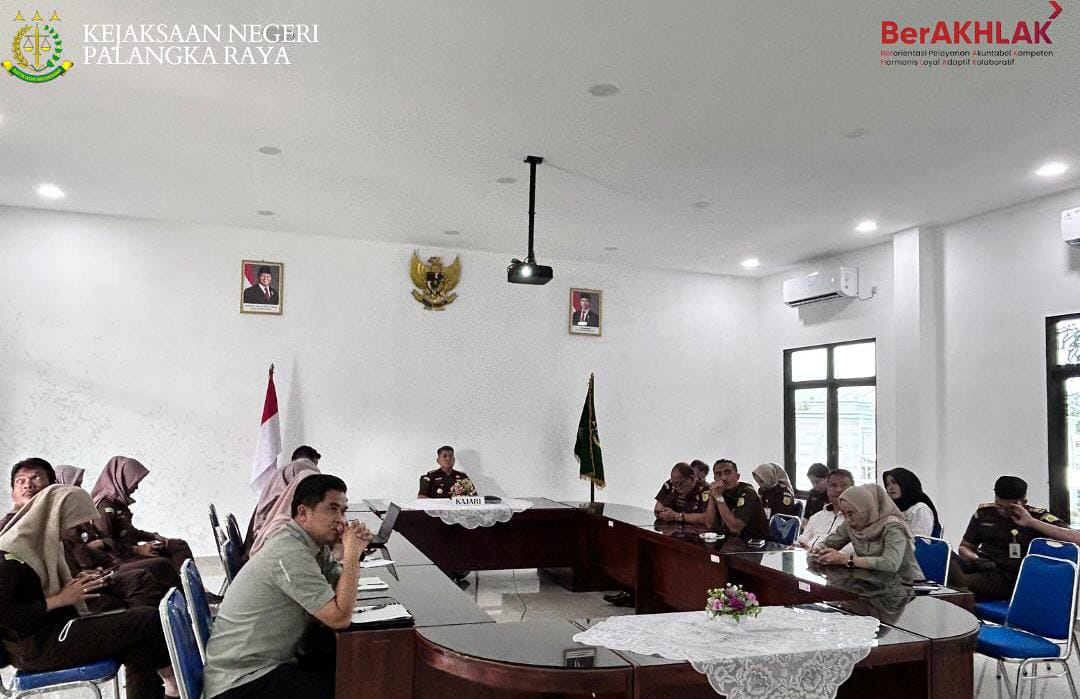 PALANGKA RAYA, Kalteng.co – Dalam rangka meningkatkan kinerja dan profesionalisme seluruh aparat kejaksaan, Kepala Kejaksaan Negeri (Kajari) Palangka Raya, Andi Murji Machfud, S.H., M.H., bersama Kasubagbin, para kepala seksi (Kasi), serta seluruh pegawai Kejaksaan Negeri Palangka Raya mengikuti kegiatan sosialisasi dan pembekalan yang disampaikan oleh Jaksa Agung Muda Bidang Pengawasan secara daring, Rabu (8/1/2025).
