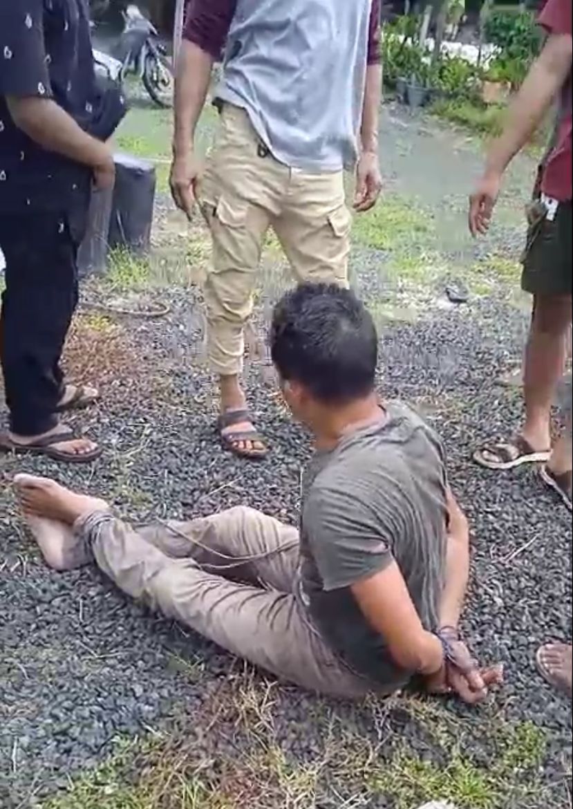 Dari rekaman video itu terlihat, pria menggunakan baju kaos abu dan celana panjang dengan tangan terikat itu hanya dapat terdiam pasrah usai aksinya itu tertangkap basah oleh masyarakat setempat.