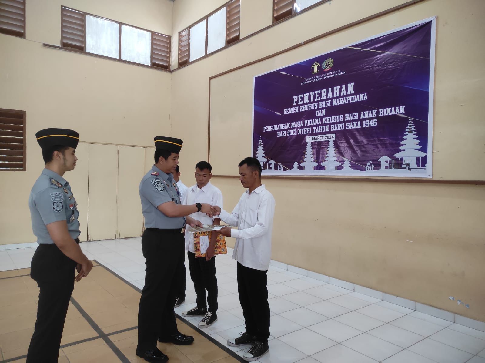 Hari Raya Nyepi Tahun Baru Saka 1946/ 2024 M membawa kesan tersendiri bagi seluruh WBP. Pasalnya sejumlah WBP Lapas Pangkalan Bun yang beragama hindu menerima Remisi Khusus. Dan  Pemberian remisi ini berdasarkan Keputusan Menteri Hukum dan Hak Asasi Manusia Republik Indonesia Nomor: PAS-406.PK.05.04 TAHUN 2024 Tentang Pemberian Remisi Khusus (RK) Nyepi Tahun 2024.