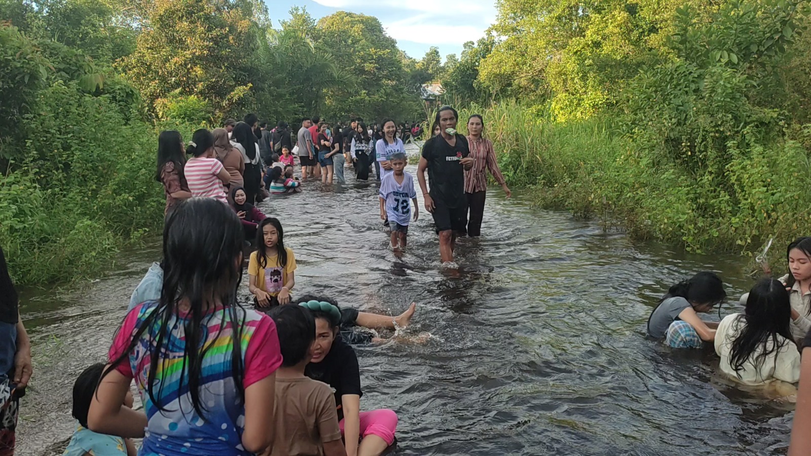 Kondisi itu justru menarik perhatian masyarakat. Ratusan orang dari berbagai usia, mulai dari anak-anak hingga orang dewasa, memanfaatkan genangan air untuk bermain, mandi, dan berfoto. Suasana ramai terlihat sepanjang titik jalan yang tergenang, khususnya di bagian jalan yang rendah.