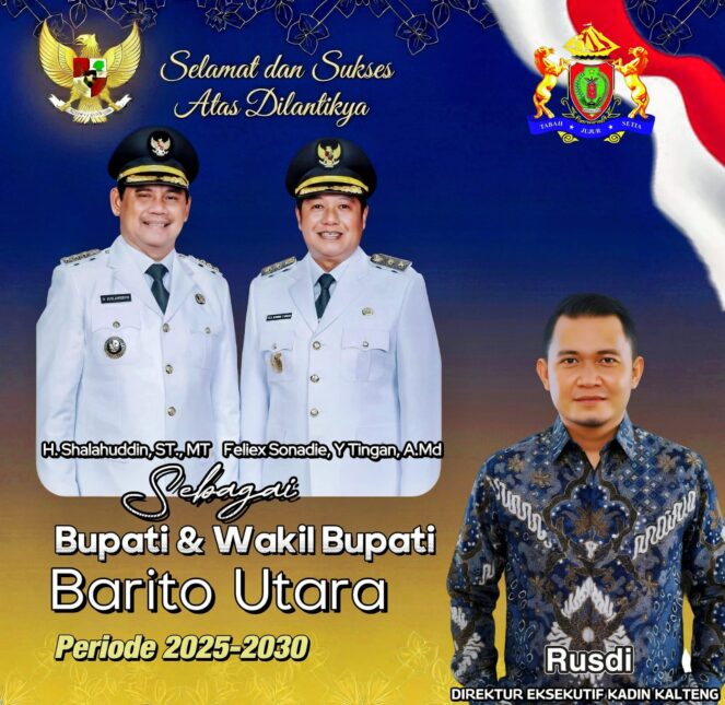 PALANGKA RAYA, Kalteng.co – Direktur Eksekutif Kamar Dagang dan Industri (Kadin) Kalteng, Rusdi, turut menyampaikan ucapan selamat dan sukses atas dilantiknya H. Shalahuddin dan Felix Sonadie sebagai Bupati dan Wakil Bupati Barito Utara periode 2025–2030.