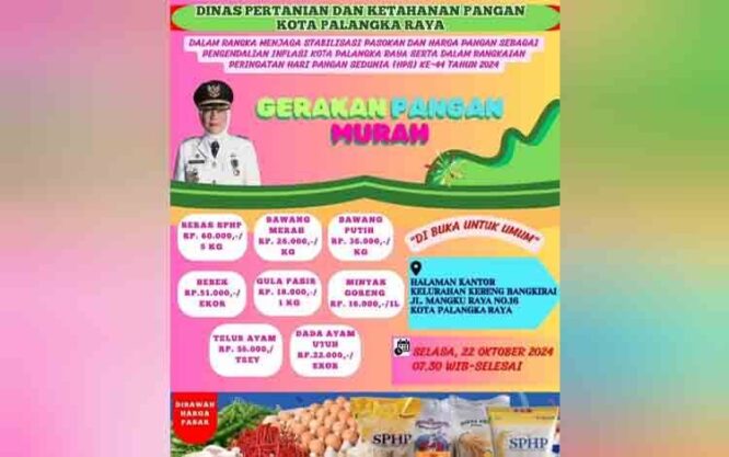 PALANGKA RAYA, Kalteng.co – Dalam rangka menjaga stabilitas pasokan dan harga pangan sebagai pengendalian inflasi di Palangka Raya, serta memperingati Hari Pangan Sedunia ke-44 tahun 2024, Dinas Pertanian dan Ketahanan Pangan Palangka Raya akan mengadakan gerakan pangan murah di halaman Kantor Kelurahan Kereng Bangkirai pada 22 Oktober 2024.