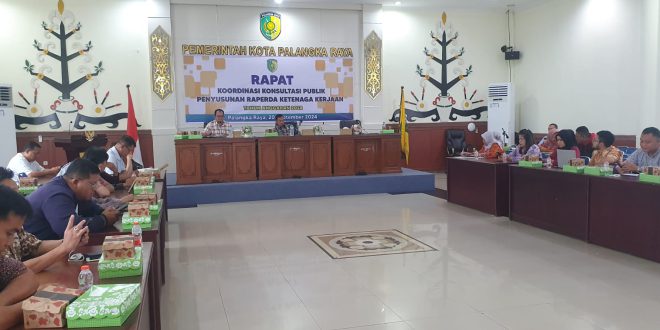 PALANGKA RAYA, Kalteng.co – Pemko Palangka Raya melalui Dinas Ketenagakerjaan (Disnaker) menggelar Rapat Koordinasi dan Konsultasi Publik Penyusunan Rancangan Peraturan Daerah (Raperda) Ketenagakerjaan. Kegiatan ini berlangsung di Ruang Peteng Karuhei II, Kantor Wali Kota Palangka Raya, Jumat (20/9/2024).