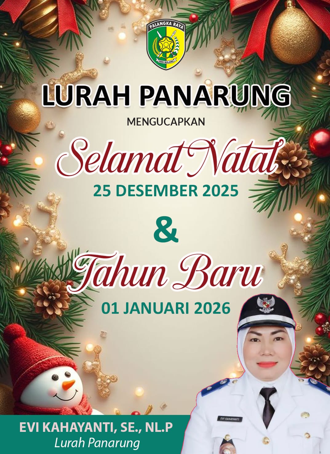 PALANGKA RAYA, Kalteng.co – Lurah Panarung, Evi Kahayanti, S.E., NL.P., menyampaikan ucapan Selamat Hari Natal 2025 dan Tahun Baru 2026 kepada seluruh umat Kristiani serta masyarakat Kelurahan Panarung, Kota Palangka Raya.