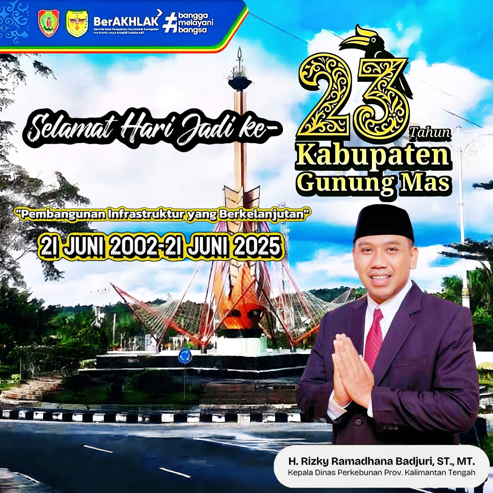 “Selamat ulang tahun ke-23 untuk Kabupaten Gunung Mas. Usia ini bukan hanya soal angka, tetapi juga cerminan dari proses panjang pembangunan dan pelayanan kepada masyarakat. Kami di Dinas Perkebunan Kalteng sangat mengapresiasi upaya pemerintah daerah dalam membangun dari hulu ke hilir,” ujar Rizki.
