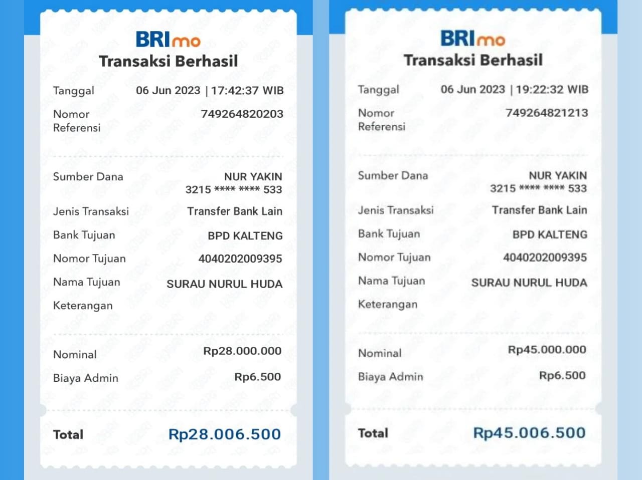 “Beliau meminta nama lengkap, foto KTP saya dan juga nomor rekening. Tidak lama berselang saya mendapat kiriman via WA berupa bukti transfer dari atas nama Nuryakin ke rekening atas nama Surau Nurul Huda sebesar Rp. 28.000.000. Menurut penjelasan beliau bahwa ini merupakan transfer tahap pertama,” imbuh Murimin.