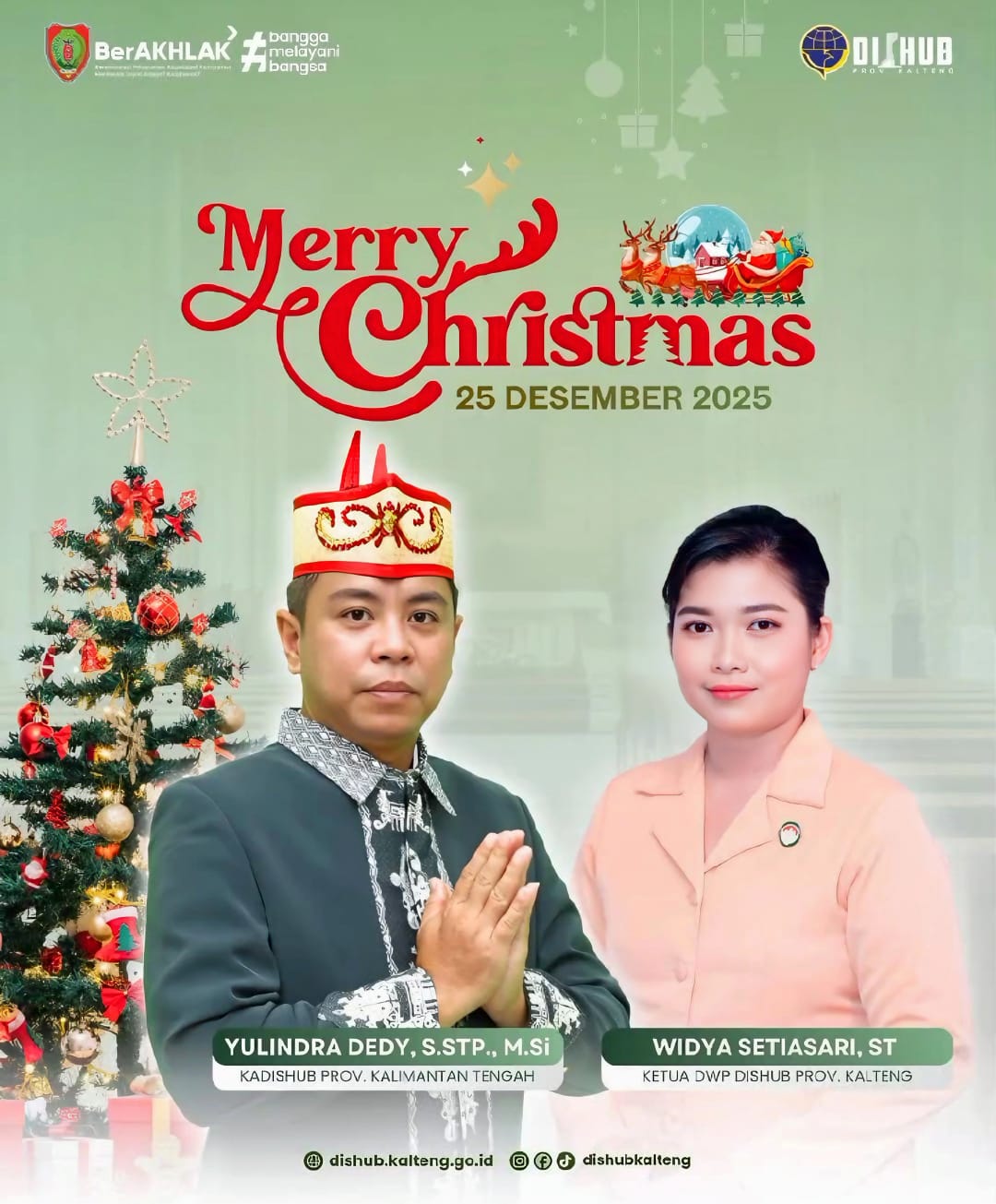 PALANGKA RAYA, Kalteng.co – Kepala Dinas Perhubungan Provinsi Kalimantan Tengah, Yulindra Dedy, S.STP., M.Si., bersama Ketua Dharma Wanita Persatuan (DWP) Dinas Perhubungan Provinsi Kalimantan Tengah, Widya Setiasari, S.T., menyampaikan ucapan Selamat Hari Natal 2025 dan Tahun Baru 2026 kepada seluruh umat Kristiani serta masyarakat Kalimantan Tengah.