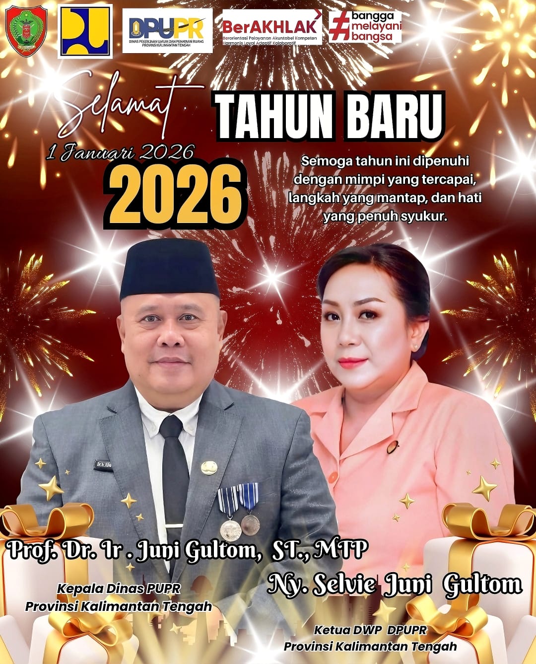 PALANGKA RAYA, Kalteng.co – Kepala Dinas Pekerjaan Umum dan Penataan Ruang (PUPR) Provinsi Kalimantan Tengah, Prof. Dr. Ir. Juni Gultom, ST., MTP, bersama Ketua Dharma Wanita Persatuan (DWP) DPUPR Provinsi Kalimantan Tengah, Ny. Selvie Juni Gultom, menyampaikan ucapan Selamat Tahun Baru 2026 kepada seluruh masyarakat Kalimantan Tengah.