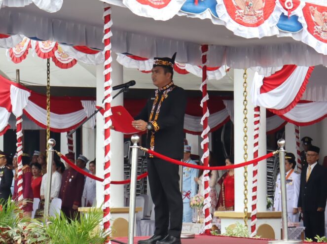 Ketua DPRD Gunung Mas, Binartha, yang bertugas membacakan teks Proklamasi Kemerdekaan RI pada upacara di halaman Kantor Bupati Gunung Mas, Minggu (17/8/2025), mengajak warga menyambut HUT RI dengan penuh semangat dan antusias.