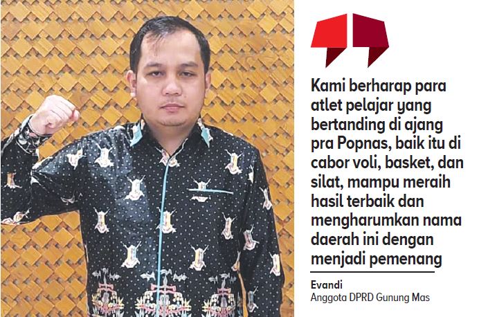 ”Kami berharap para atlet pelajar yang bertanding di ajang pra Popnas, baik itu di cabor bola voli, basket, dan silat, mampu meraih hasil terbaik dan mengharumkan nama daerah ini dengan menjadi pemenang,” kata anggota Dewan Perwakilan Rakyat Daerah (DPRD) Kabupaten Gumas Evandi, Selasa (18/10).