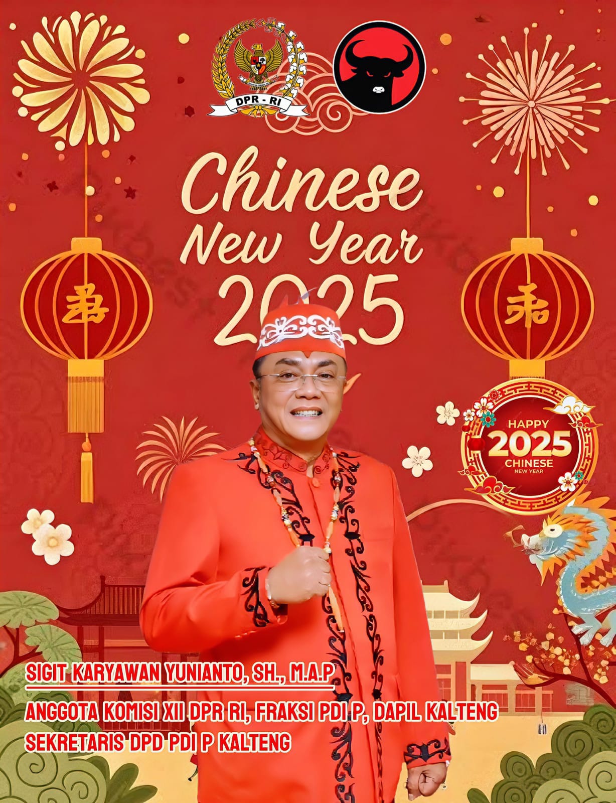 Anggota DPR RI dari Fraksi PDI Perjuangan, Dapil Kalimantan Tengah, Sigit Karyawan Yunianto, SH., M.A.P., turut menyampaikan ucapan selamat kepada masyarakat yang merayakan. Ia berharap Tahun Baru Imlek membawa kebahagiaan, kesejahteraan, dan kedamaian bagi semua, serta mempererat hubungan antarsesama dalam semangat persatuan dan keberagaman.