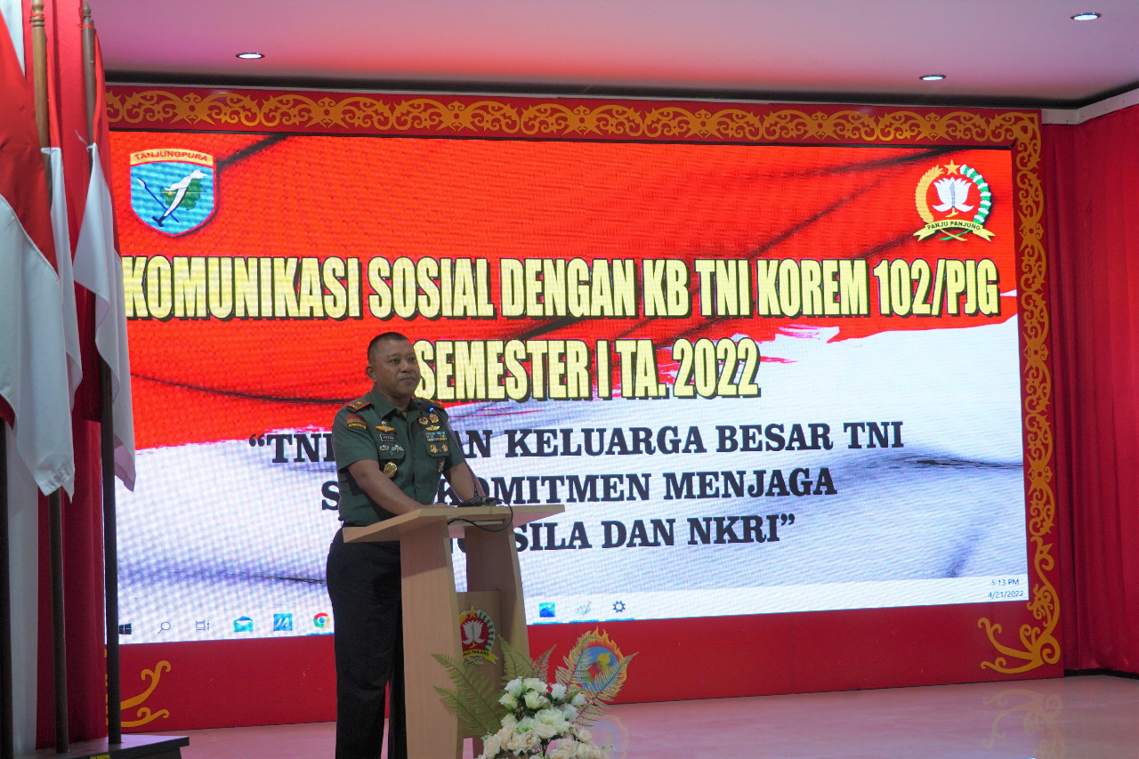 Dalam sambutannya Komandan Korem 102/Pjg Brigjen TNI Yudianto Putrajaya, S.E.,M.M.,menyampaikan kegiatan Komsos dilaksanakan dimaksudkan sebagai ajang mempererat silaturahmi, dan yang terpenting komunikasi yang sudah terjalin, dapat memberikan andil positif untuk menciptakan situasi keamanan yang aman dan kondusif bagi masyarakat Indonesia, wilayah Kalimantan Tengah khususnya.