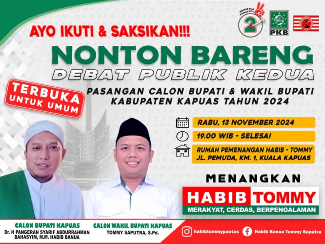 Kegiatan nobar ini terbuka untuk umum, dan pasangan calon nomor urut 02 ini mengajak seluruh masyarakat Kapuas untuk hadir dan turut serta menyaksikan jalannya debat publik. Dalam ajakan mereka, Habib Banua dan Tommy berharap, acara nobar ini menjadi momentum kebersamaan yang sekaligus memperlihatkan dukungan dan antusiasme masyarakat terhadap visi dan misi yang mereka usung.