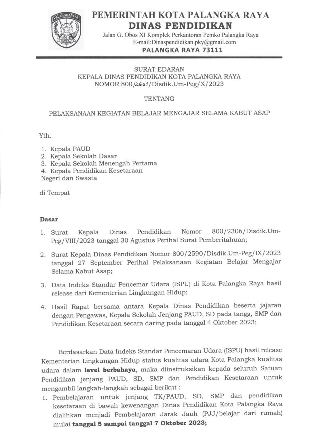 - Pembelajaran untuk jenjang TK/PAUD, SD, SMP dan Pendidikan Kesetaraan di bawah kewenangan Dinas Pendidikan Kota Palangka Raya dialihkan menjadi pembelajaran jarak jauh (PJJ/belajar dari rumah) terhitung tanggal 5-7 Oktober 2023.
