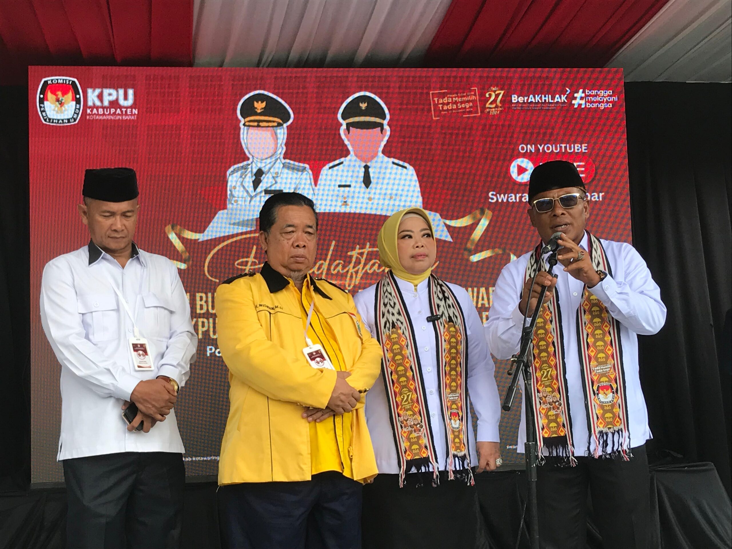 Dengan diarak menggunakan mobil campervan serta diiringi tarian khas Kabupaten Kobar dan Reog Ponorogo. Selain itu pengurus Partai Golkar dan Nasdem serta Perindo ikut mengantarkan ke Kantor Komisi Pemilihan Umum (KPU), Selasa (27/8/2024) pukul 08.46 WIB.