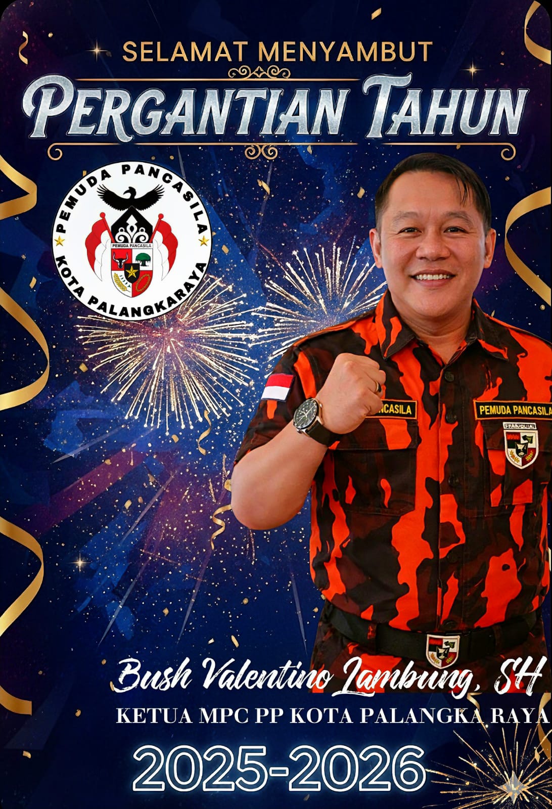 PALANGKA RAYA, Kalteng.co – Keluarga Besar Majelis Pimpinan Cabang (MPC) Pemuda Pancasila Kota Palangka Raya melalui Ketua MPC, Bush Valentino Lambung, SH., menyampaikan ucapan Selamat Tahun Baru 2026 kepada seluruh masyarakat Kota Palangka Raya dan Kalimantan Tengah.