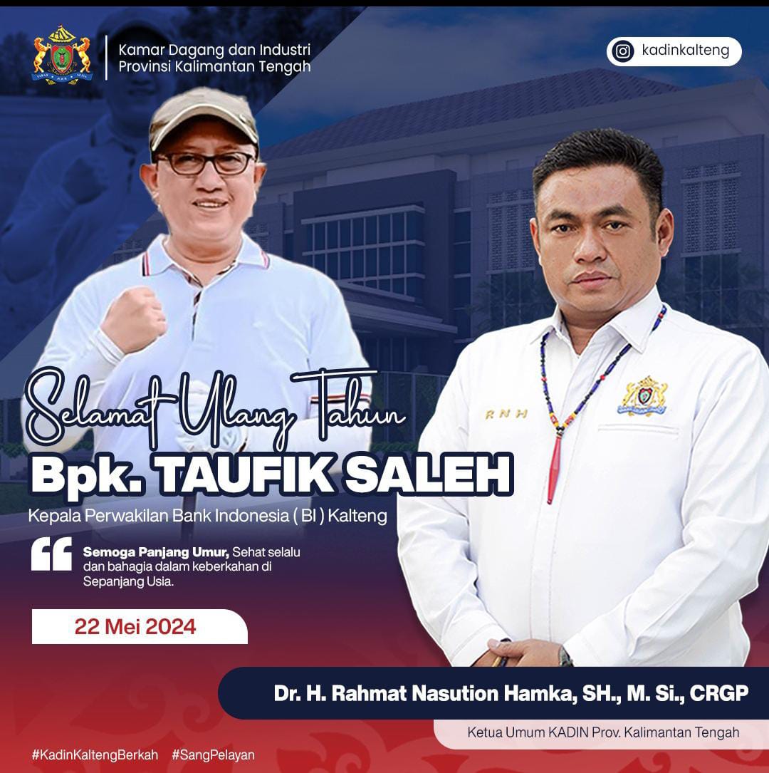 PALANGKA RAYA, Kalteng.co – Ketua Umum Kamar Dagang dan Industri (Kadin) Provinsi Kalimantan Tengah (Kalteng), Dr. H. Rahmat Nasution Hamka, SH, M.Si., CRGP., menyampaikan ucapan selamat ulang tahun kepada Kepala Perwakilan Bank Indonesia (BI) Kalteng, Bapak Taufik Saleh, yang jatuh hari ini, Rabu (22/5/2024).